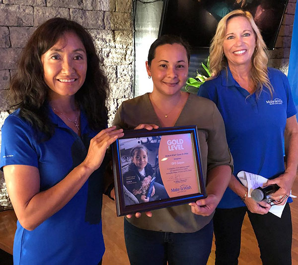Make-A-Wish Foundation of Guam and CNMI board members Wendi Herring, right, and Kanae Quinn, left, honors DFS Saipan as a gold level donor in 2017 during the foundation’s 2nd Annual CNMI Donor Appreciation Mixer last Aug. 2 at Fiesta Resort and Spa’s Chambre Bar. (MAKE-A-WISH FOUNDATION)