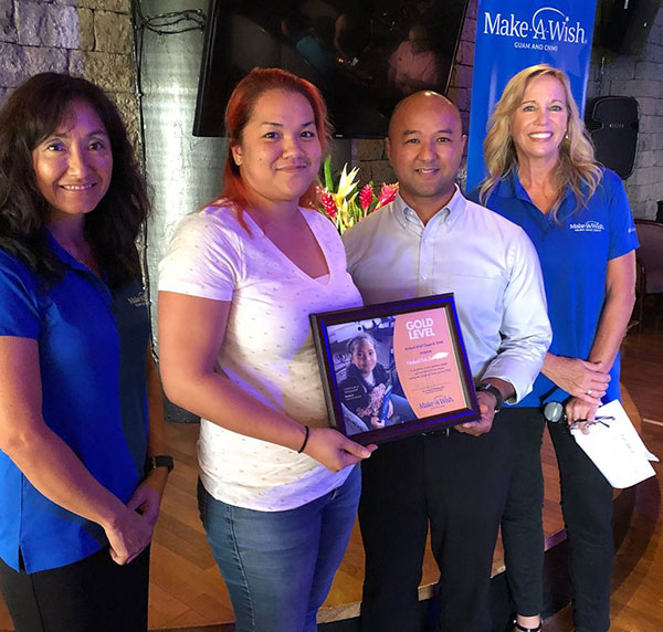 The Make-A-Wish Foundation of Guam and CNMI’s top 18 donors in 2017 were (Diamond) Bank of Guam, Hyatt Regency Saipan, and Triple J Enterprises; (Gold) DFS Saipan, Fiesta Resort & Spa Saipan, Imperial Pacific International, Marianas Variety, Naked Fish Bar & Grill, and The Shack; (Silver) Bank of Saipan, BFJ Corp., Bridge Capital LLC, Docomo Pacific, Gold’s Gym Saipan, JC Tenorio Enterprises, MarPac, McDonald’s, and TakeCare.
