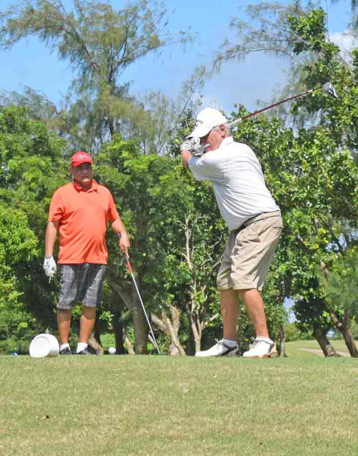 One of the local golfers watches the direction of his shot after teeing off at Laolao east’s No. 9.