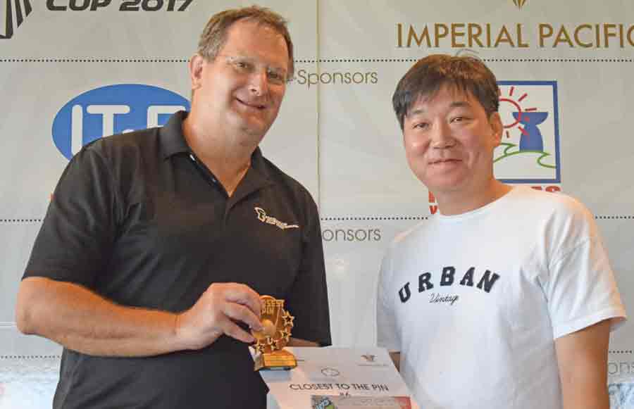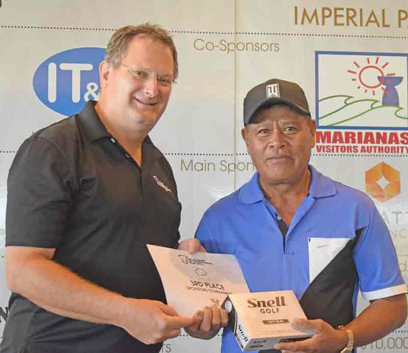 Imperial Pacific International (CNMI) LLC Marketing and Public Affairs director David Largent, left, awards the sponsors tournament third place trophy to Prescil Azarcon during last Sunday’s banquet for the Marianas International Cup 2017 at Laolao Bay Golf & Resort’s The Grill.