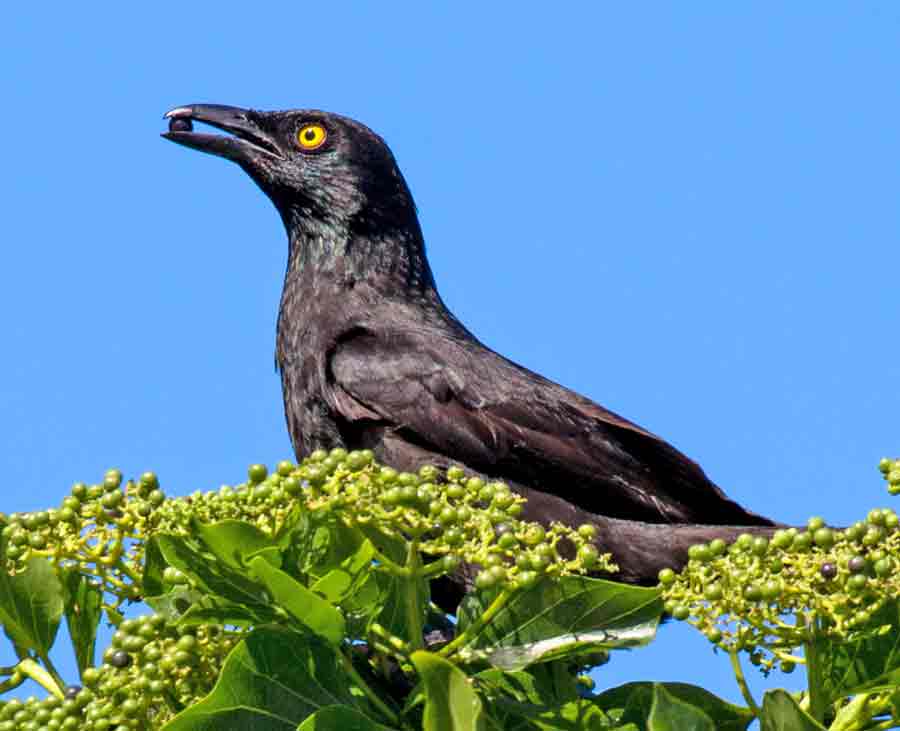 Photo shows a starling with a fruit in its beak. (Lainie Berry)