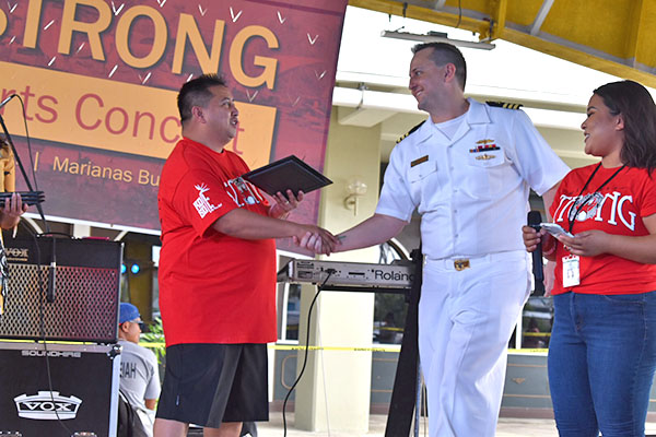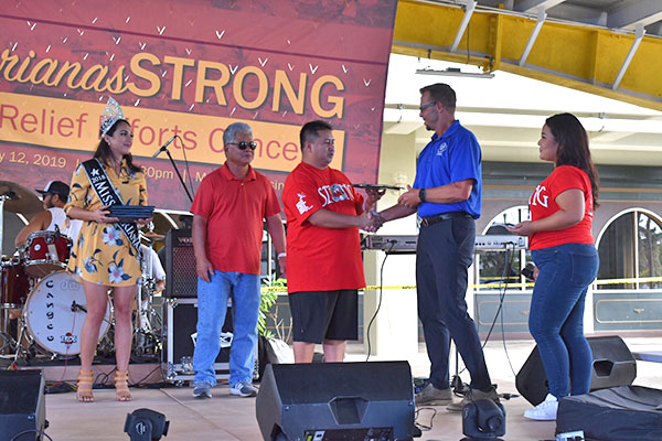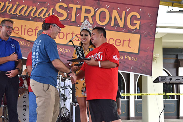 Marianas Young Professionals executive director Gerard Van Gils receives a plaque of recognition from Gov. Ralph DLG Torres during last Saturday’s #MarianasStrong inaugural concert at the Marianas Business Plaza.