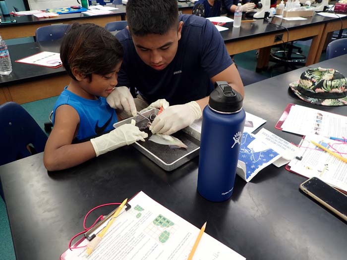 The five-hour “Day in the Life” at UOG’s Marine Lab included tasks that a marine biologist may perform regularly. Youth participants, ages 7 to 15 years old, observed jellyfish, sea cucumbers, and starfish in touch tanks, practicing survey techniques used to describe and monitor organisms. They also spent a few hours doing lab work.