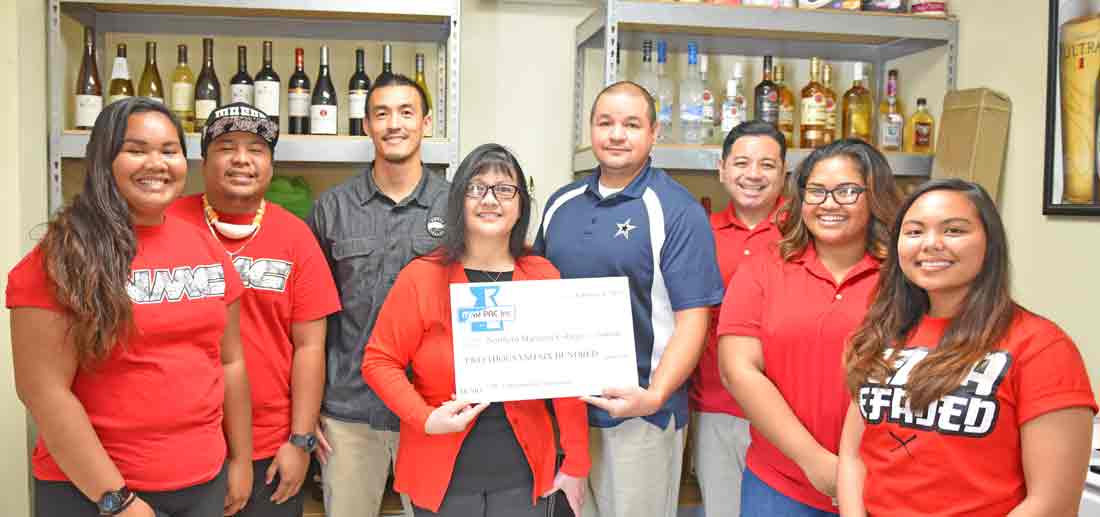 Marianas Pacific Distributors donated over $2,500 in cash, beverages, and gift items to the NMC Foundation. The donation includes ice coffee, an assortment of beers, and golf prizes. From left: Joelin Mettao, NMC student; Raymond Nakazato, NMC student; James Lee, MarPac Beverage Sales and Marketing manager; Dr. Carmen Fernandez, NMC president; Guy Pudney, MarPac resident manager; Frankie Eliptico, interim VP of advancement; Victoria Deleon Guerrero, NMC marketing coordinator; and Trina Santos, NMC student. (NMC)