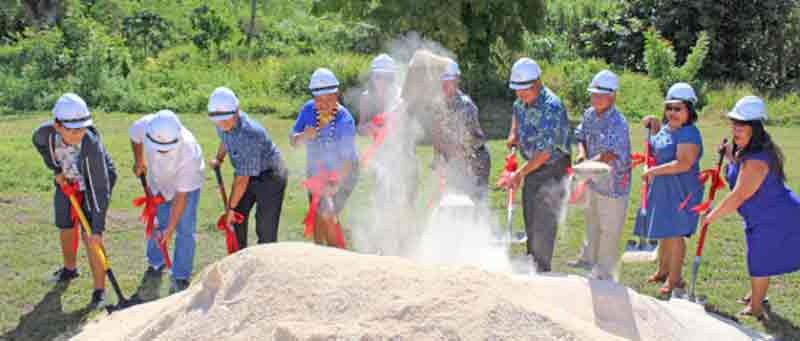 Acting Board of Education chair Janice Marie A. Tenorio, Education Commissioner Cynthia Deleon Guerrero, Marianas High School principal Cherlyn Cabrera, acting governor Arnold Palacios, Saipan Mayor David Apatang, Public School System-Capital Improvement Project coordinator Rachel Fusco, Public Works Secretary James Ada, U.S. Office of Insular Affairs field representative Harry Blanco, contractor HBR International Inc.’s Gilbert Saludez, and MHS Student Council president Yuuki Nishida turn the first sod for MHS’ new cafeteria. (Contributed Photo)