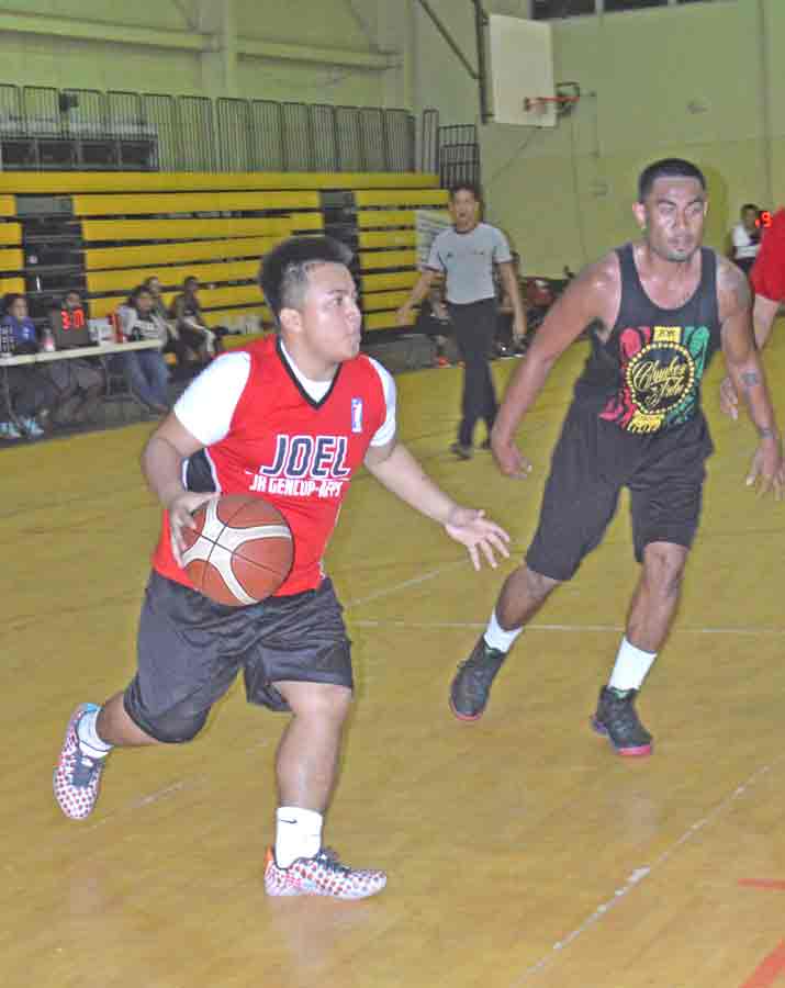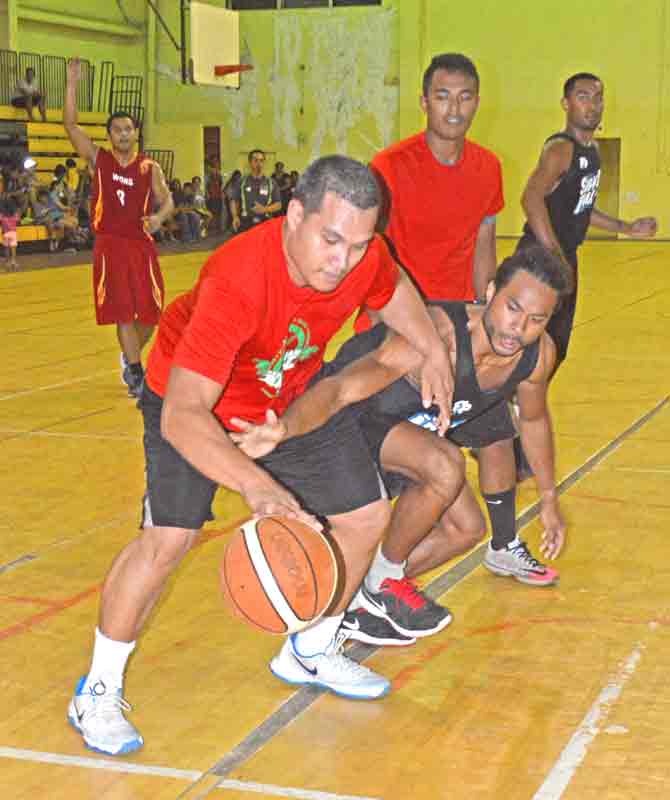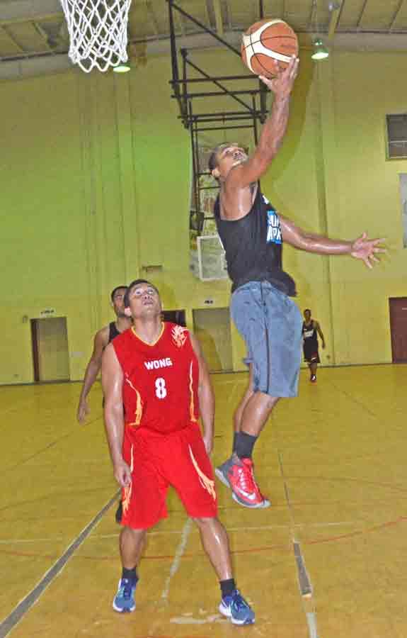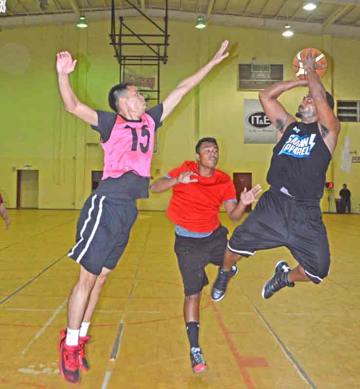 Saipan Apparel’s Joshua Andrew goes for a point-blank shot against the Ol’Aces’ Jesse Santos, right, while the latter’s teammate Nak Nakashima looks on.