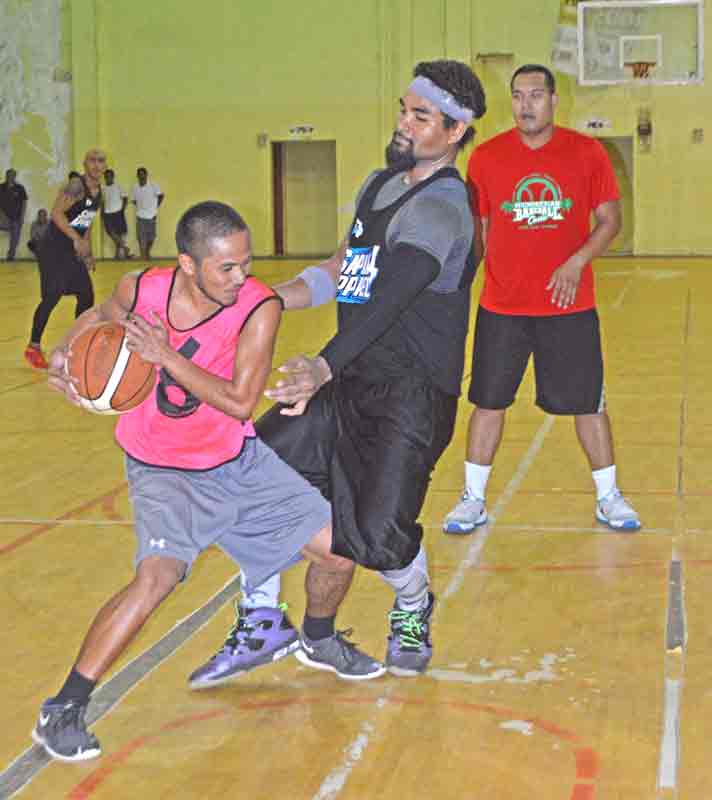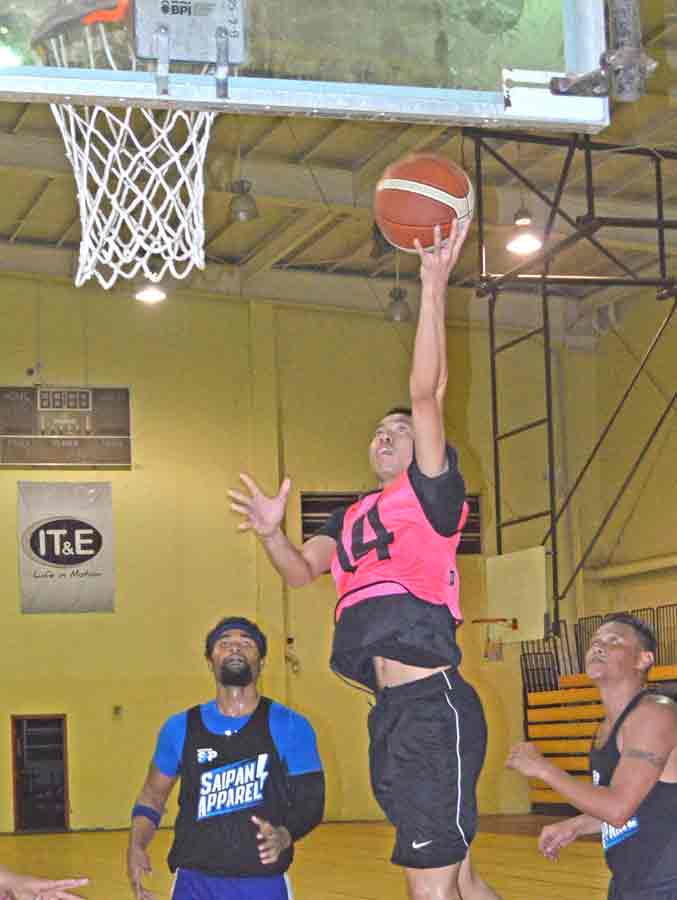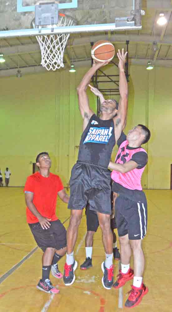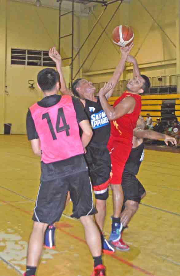 Saipan Apparel’s Syl Teregeyo pulls up for a jumper against the outstretched arms of the Ol’Aces’ Jesse Santos and in front of Nak Nakashima during Game 2 of their title duel in the Mariana Islands Basketball Federation’s Inaugural Men’s Outdoor League last Tuesday at the Gilbert C. Ada Gymnasium.