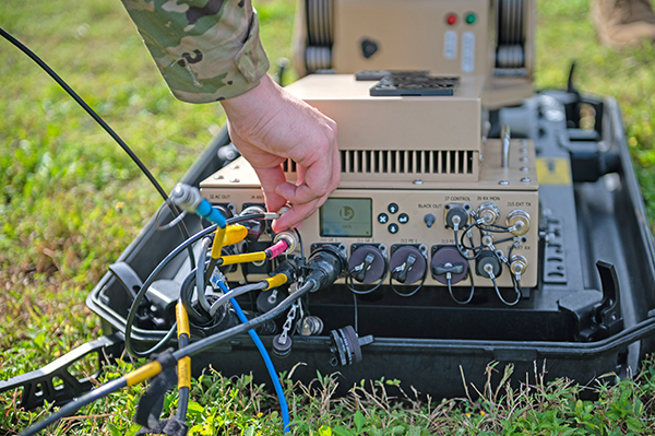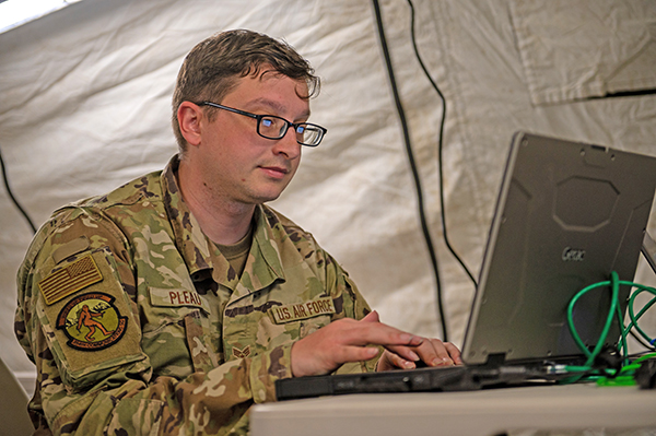 Senior airman Michael Pleau, 354th Communications Squadron communication flyaway kit technician, configures a tactical switch for Air Force network connectivity in support of Cope North 22 on Rota in the Northern Mariana Islands, Feb. 15, 2022. (U.S. AIR FORCE/AIRMAN 1ST CLASS YOSSELIN PERLA)