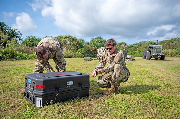 Senior airman Michael Pleau, 354th Communications Squadron communication flyaway kit technician, left, and Tech. Sgt. Joshua Lehne, 354th CS CFK lead, pack up a Hawkeye satellite communications system on Rota in the Northern Mariana Islands last Feb. 15, 2022. ( U.S. AIR FORCE/AIRMAN 1ST CLASS YOSSELIN PERLA)