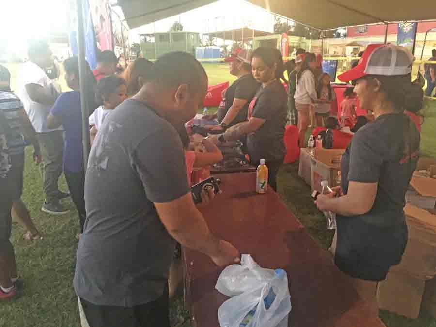 Docomo Pacific staff pass out free merchandise during the Docomo Pacific/United Airlines Movie and Music Night at the Francisco C. Palacios Baseball Field last Saturday night.