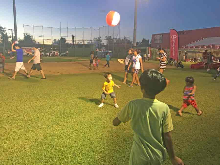 Children enjoy the company of one another while putting to use the free beachballs given out by Docomo Pacific during the Docomo Pacific/United Airlines Movie and Music Night at the Francisco C. Palacios Baseball Field last Saturday night.