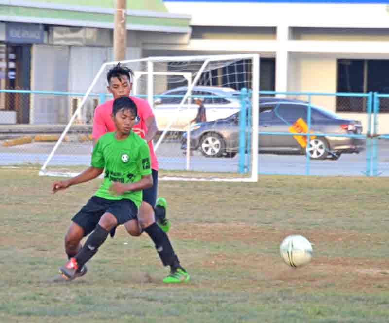 TanHoldings Football Club’s Alan Hinson, left, steals the ball from an MP United FC player during the second half of their playoff match for the boys U17 division title in the 2017 NMIFA Youth Spring League last Tuesday at the Hopwood Middle School Field. MP United won, 4-2.