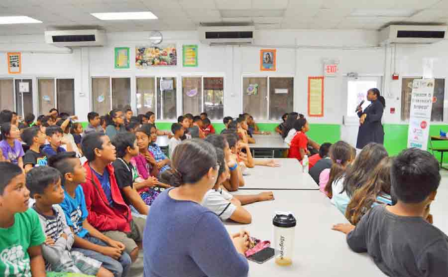 MY Pros’ member Nola Hix addresses students during the presentation of the Marianas Tourism Education Council at Koblerville Elementary on April 6, 2017. Hix shared about her career experiences and the importance of treating others well. (Contributed Photo)