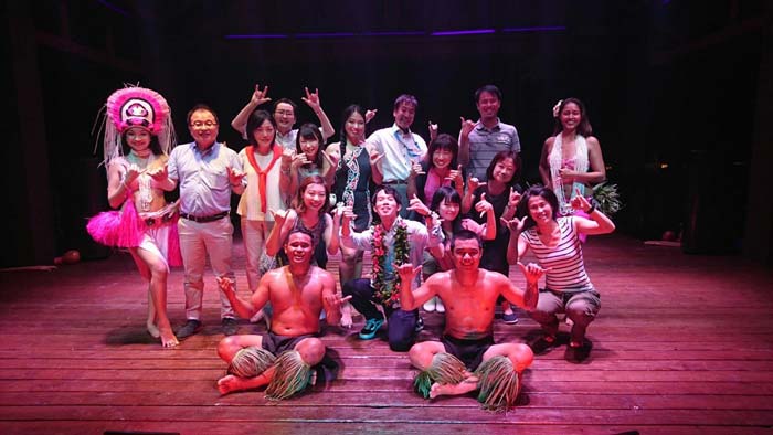 Travel agents from Japan pose with dancers at the Joyful Dinner Show at Fiesta Resort & Spa Saipan on Oct.14, 2017, as part of a familiarization tour organized by the Marianas Visitors Authority and Delta Air Lines. (MVA)