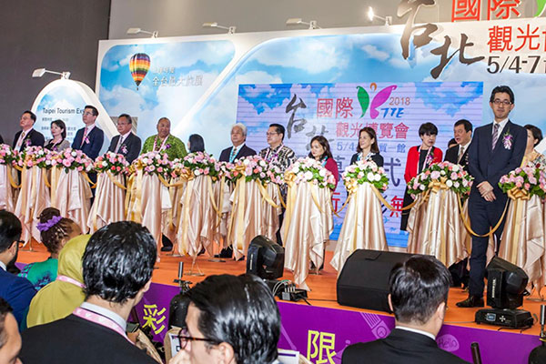 Marianas Visitors Authority deputy managing director Judy Torres, sixth from right, joins the ribbon-cutting ceremony of Taipei Tourism Expo 2018 on May 4, 2018. (MVA)