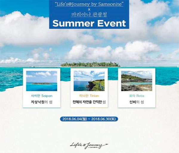 The Marianas Visitors Authority has partnered with Samsonite Korea, the worldwide leader in superior travel luggage and accessories, on a consumer promotion targeting summer vacation season. Five lucky winners of the promotion will receive a Saipan travel voucher including airline tickets and accommodation for two people to spend a wonderful holiday in this resort destination.