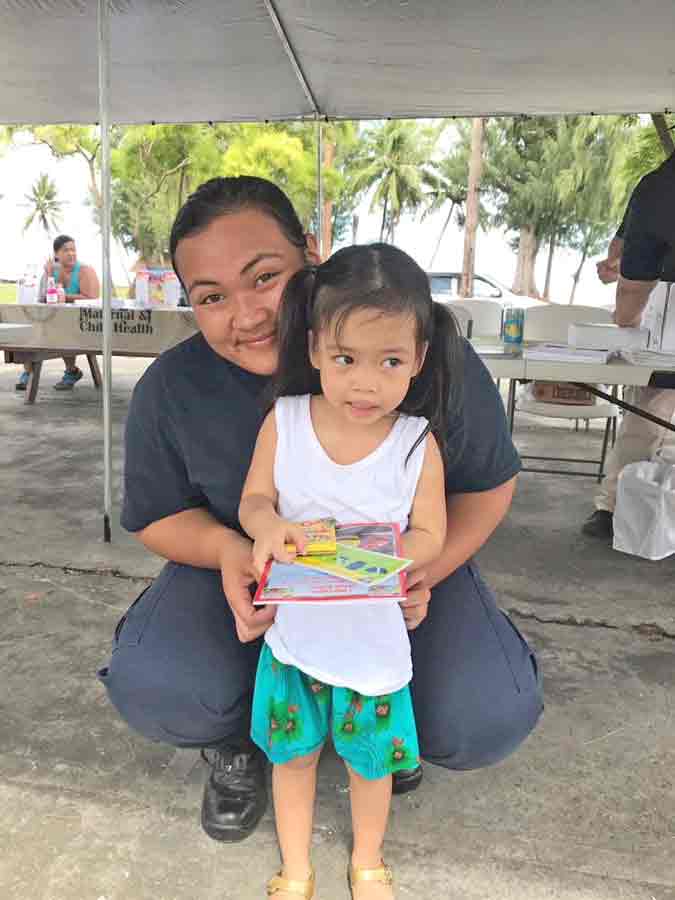First responder Nipi Tenorio Laniyo poses for a photo with one of the children present during the National Car Seat Check and Family Fun Day last Saturday at the Susupe Civic Center. (Donna Liwag)