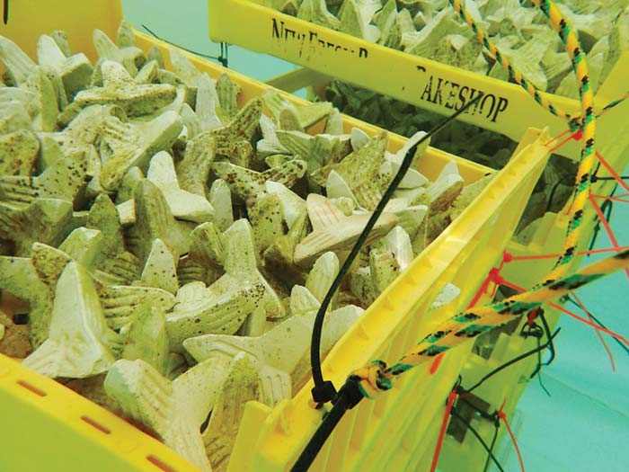 Six hundred of the tiles are being housed in the UOG marine lab and two pools of 700 tiles each are in a coral nursery—a sufficiently deep, sheltered, secure area in nearshore waters conducive to the growth of the environment-sensitive larvae. As they mature, the coral will be planted on the reef, probably all within the next year.