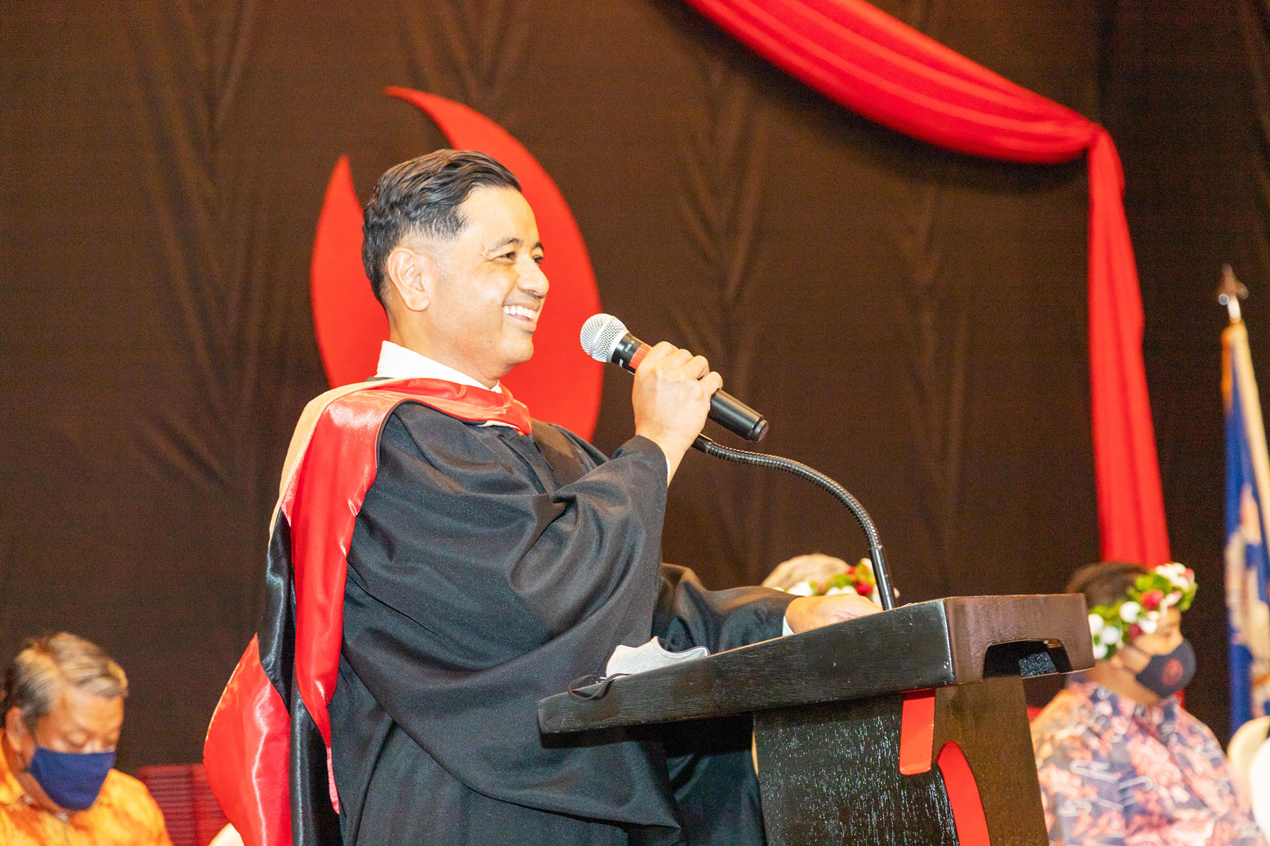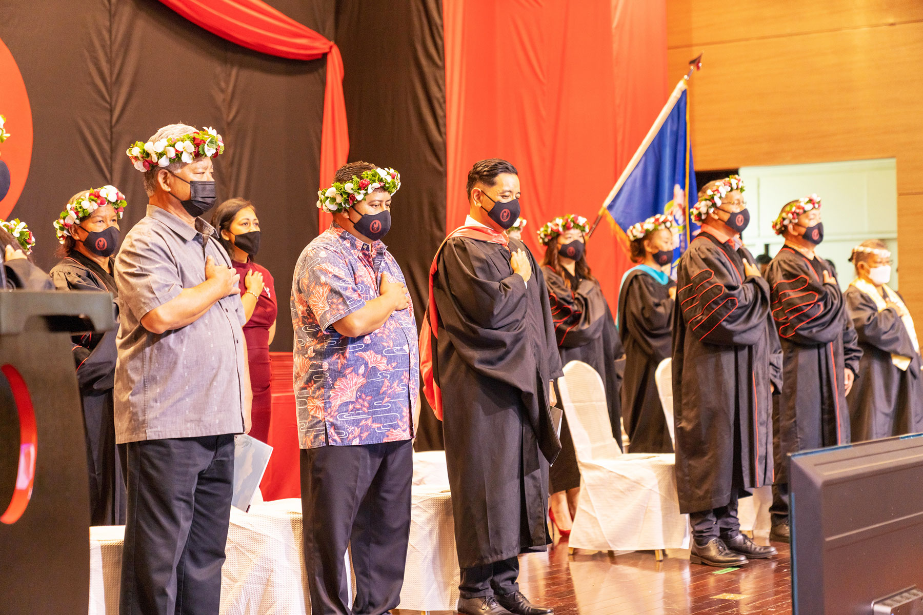 From left, Lt. Gov. Arnold I. Palacios, Gov. Ralph DLG Torres, and interim president Frankie Eliptico along with the NMC Board of Regents stand for the national anthem. (NMC)