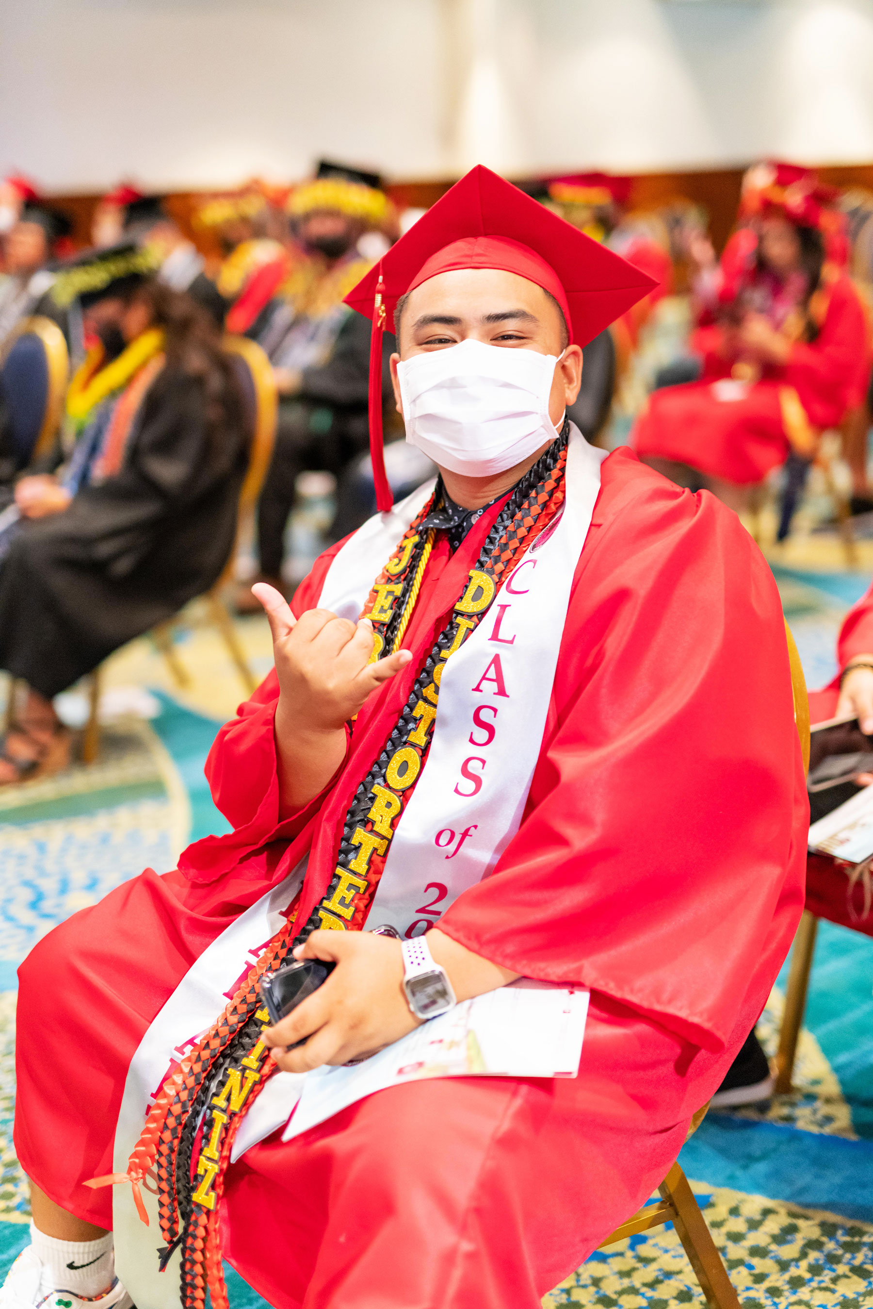 NMC graduate Ezekiel Macario, center, is seen with other graduates at the Saipan World Resort, one of three sites used for NMC’s Commencement Exercise. (NMC)