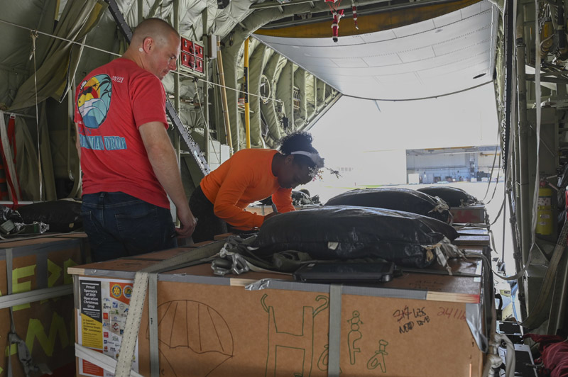 A U.S. Air Force airman signs one of the bundles during Operation Christmas Drop hosted by Andersen Air Force Base, Guam, Dec. 8, 2021. (Photos by U.S. AIR FORCE/AIRMAN BREANNA GOSSETT)