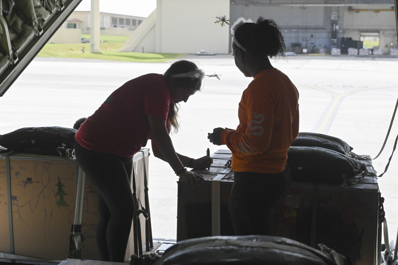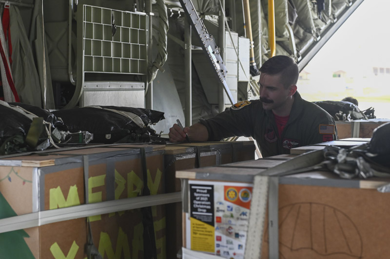 U.S. Air Force airmen sign one of the bundles during Operation Christmas Drop hosted by Andersen Air Force Base in Guam last Dec. 8, 2021. Christmas Drop is an annual operation that gives supplies to more than 55 small islands in the Pacific during the holiday season.