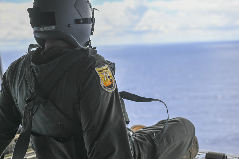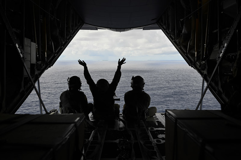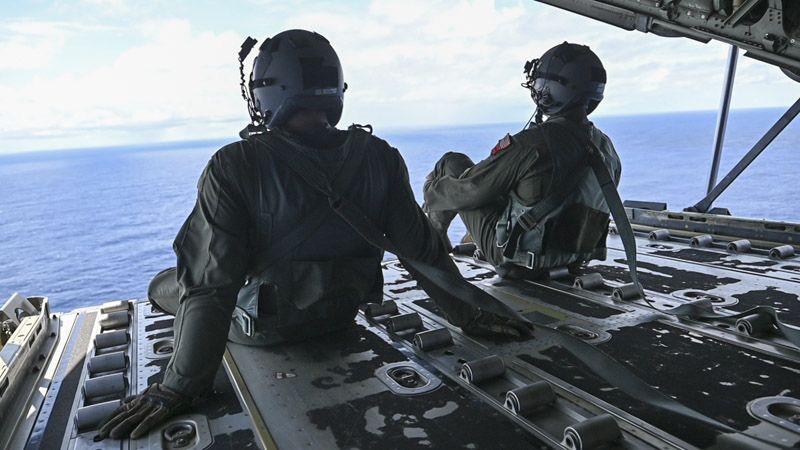 A U.S. Air Force airman sits on the ramp of a C-130J Super Hercules after dropping bundles of supplies during Operation Christmas Drop hosted by Andersen Air Force Base, Guam, Dec. 8, 2021.