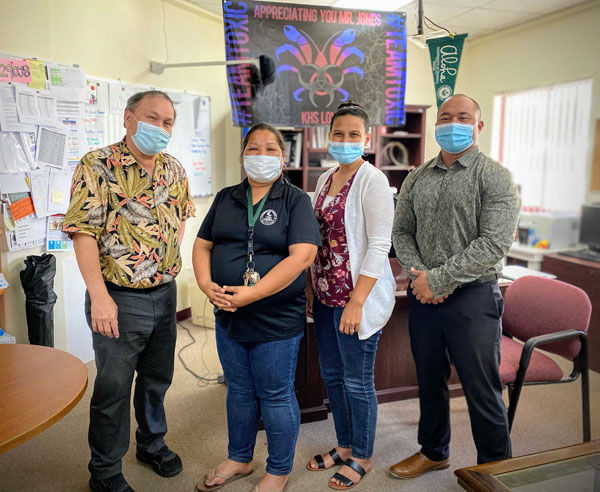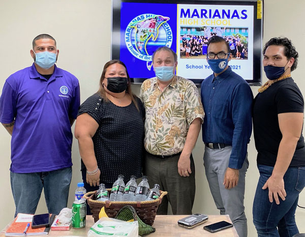 CNMI Board of Education chair Andrew L. Orsini, left, joins Kagman High School principal Ben Jones, vice principal for Discipline Francisca Bondoc, and counselor Shirley Norita for a photo.