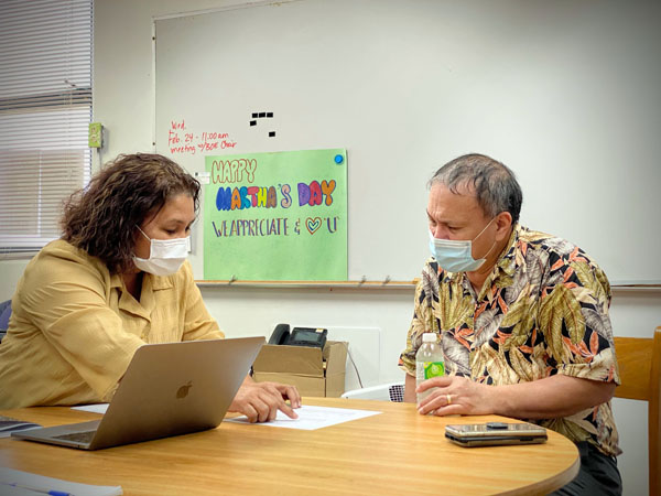 CNMI Board of Education chair Andrew L. Orsini, right, talks with Chacha Oceanview Middle School principal Martha Kintol. They were joined by vice principal Le’ah Murphy (not in photo).