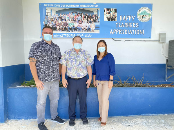 CNMI Board of Education chair Andrew L. Orsini is flanked by Gregorio T. Camacho Elementary School principal Raena Bermudes and vice principal Melissa Mendez following a campus visit.