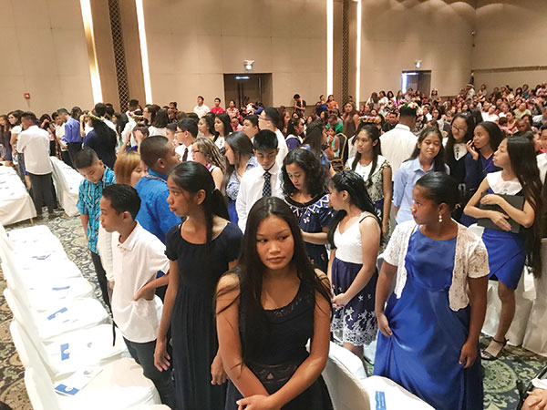 Graduates of Francisco M. Middle School prepare for their farewell march last Wednesday at the Saipan World Resort’s Royal Taga Hall. (Kimberly A. Bautista)