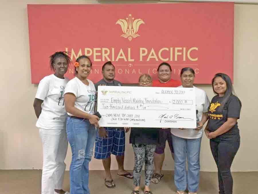 Imperial Pacific International (CNMI) LLC donates $1,000 cash and in-kind donations to Empty Vessel Ministry Foundation chair Rose Smith, left, in support of the CNMI Next Top Chef 2017 competition on Nov. 9, 2017. Also pictured are IPI staff and EVMF volunteers. (Contributed Photo)