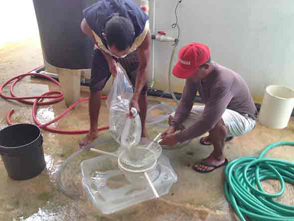 Milkfish eggs are delivered to Palau Community College Multi-Species Hatchery for larval rearing trials. (Contributed Photo)