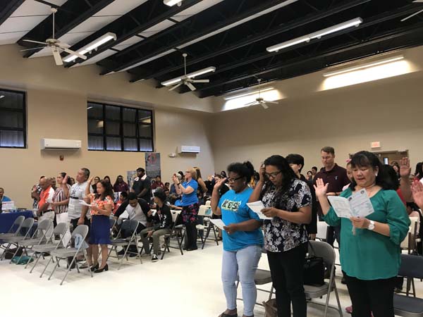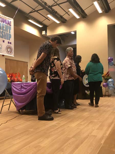 Parent leaders recite the Parents Pledge, which was led by Lizette Pascua, at the proclamation signing for Parent Leadership Month last Jan. 31 at the Kagman Community Center.