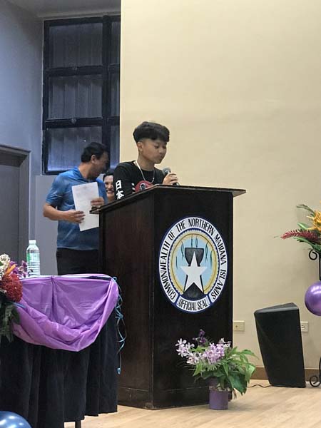 Javan Camacho, from Kagman High School, introduces his mother, Lucinda Selepeo, who read the Carolinian version of the proclamation for Parent Leadership Month last Jan. 31 at the Kagman Community Center.