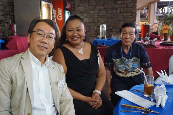 From left, Seisa Group Inc. COO, president Hajime Inoue, Marianas High School principal Cherlyn Cabrera, and Seisa High School principal Haime Kaneko at the 2018 “Participate and Learn Program” Thanksgiving dinner of Marianas High School, Francisco M. Sablan Middle School, and Seisa High School in Japan at the Saipan World Resort in San Jose last Friday.