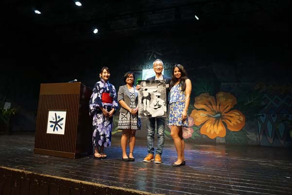 Yasuo Miyazawa receives a gift of a painting from Julia Malate of Marianas High School at the 2018 “Participate and Learn Program” Thanksgiving dinner of MHS, Francisco M. Sablan Middle School, and Seisa High School in Japan at the Saipan World Resort in San Jose last Friday.