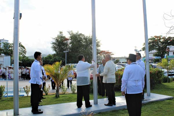 Gov. Ralph DLG Torres and Philippine honorary consul to the CNMI Glicerio Arago raise the Philippine flag during the 120th Philippine Independence Day Flag-Raising ceremony last Tuesday at the Kanoa Resort.