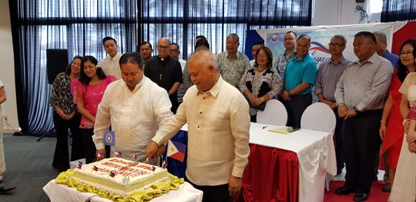 Gov. Ralph DLG Torres, left, and Philippine honorary consul to the CNMI Glicerio Arago cut the Independence Day cake after the 120th Philippine Independence Day Flag-Raising ceremony last Tuesday at the Kanoa Resort.