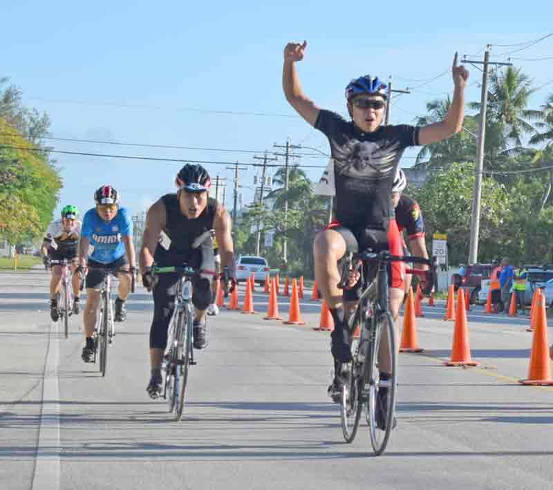 Jerome Diyco, right, raises his arms as he nears the finish line of last Saturday’s 50-kilometer Bike For Life.