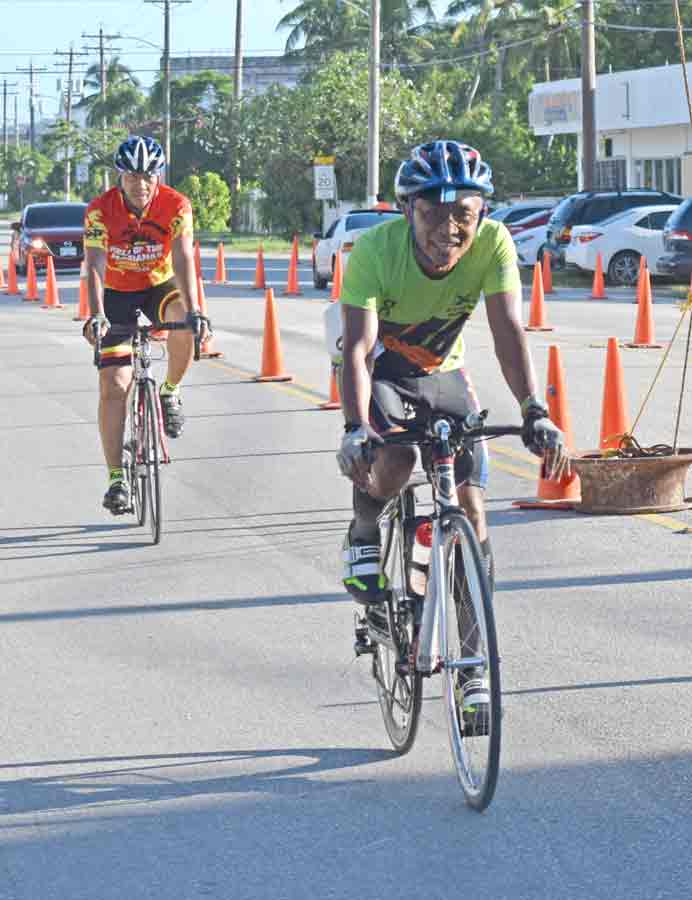 Triathlon Association of the CNMI vice president Florence Antonio, right, and Cesar Fortaleza cruise along the finish line loop.