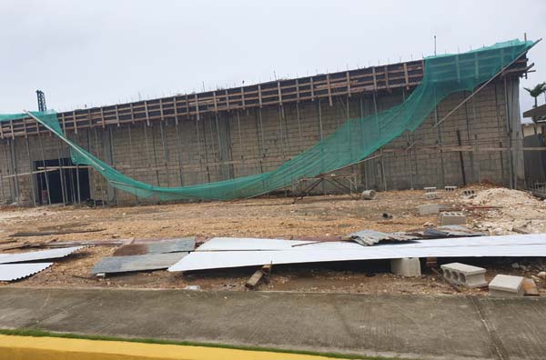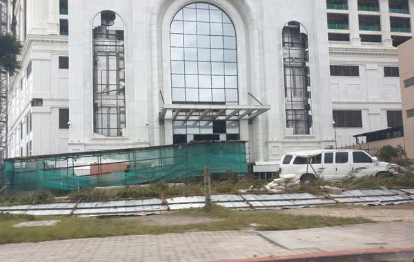 The strong winds of Super Typhoon Hagibis knocks down a tin fence at the contruction site of Imperial Pacific Resort. (Kevin Calibo)