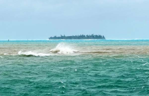 The wind brought by the tail end of Super Typhoon Hagibis whips up strong waves near the Smiling Cove Marina. Managaha Island is shown in the background. (Iva Maurin)