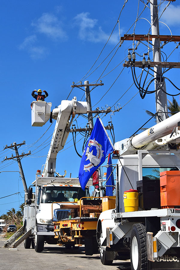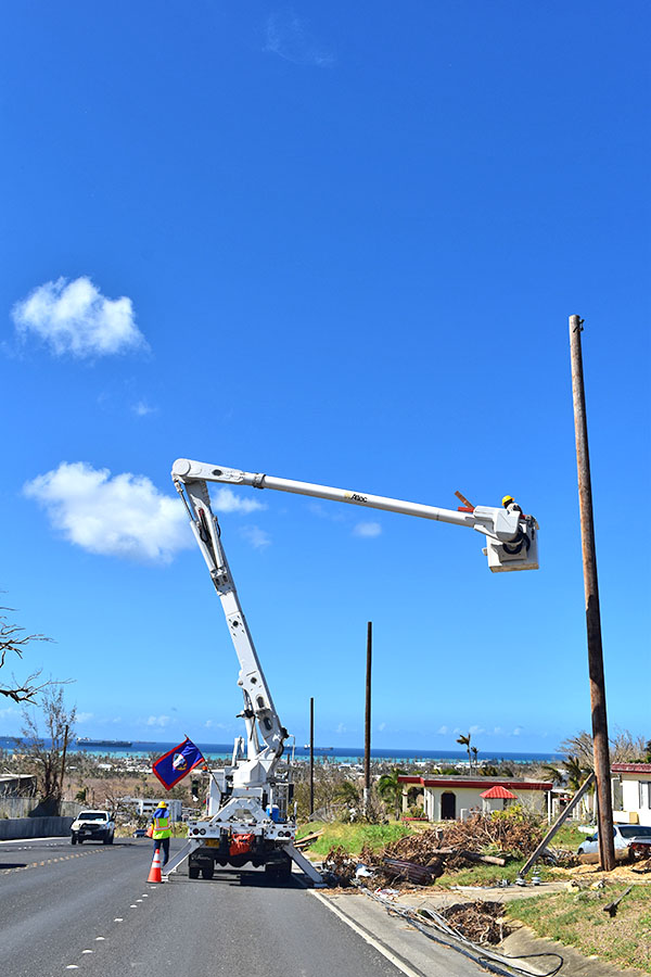 Guam Power Authority and Commonwealth Utilities Corp. personnel team up to repair the power lines near the Kiya Station along Chalan Monsignor Guerrero Road that were downed by Super Typhoon Yutu last month. (Jon Perez)