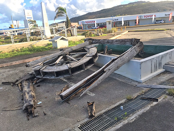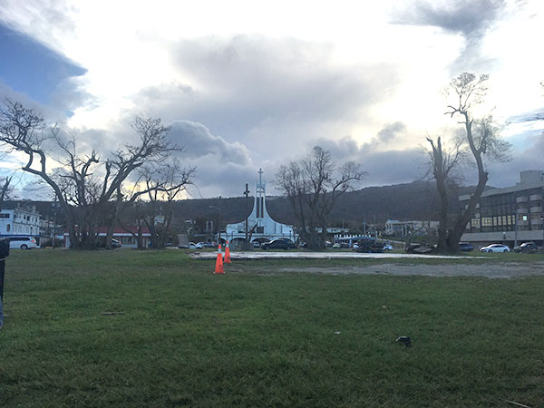 The Kristo Rai Church is seen from the Garapan Fishing Base where hundreds of cars line up daily to get free water from the military’s reverse osmosis system. Many of the trees on Saipan sport the same defoliated look. (Mark (Rabago)