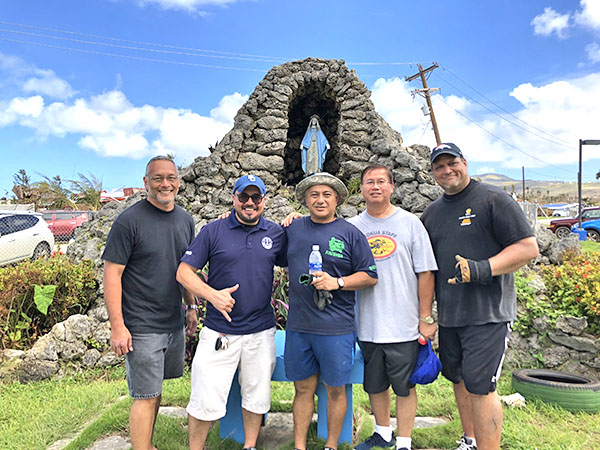 Mount Carmel School leaders show up in force for a recent school cleanup. From left are AlumKnight Association president Charles Cepeda, school president Galvin Deleon Guerrero, school board chair Vicente “Ben” Babauta, school board secretary Joe Pangelinan, and school board treasurer Will Hunter. They gathered in front of the iconic grotto for Mother Mary, which was built 50 years ago by members of the AlumKnight Class of 1968 in the aftermath of Typhoon Jean. (Contributed Photo)