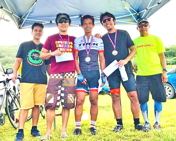 Race organizers Jay Diyco, left, and Florence Antonio, right, pose with the Top 3 placers (men’s overall) during the awards ceremony.