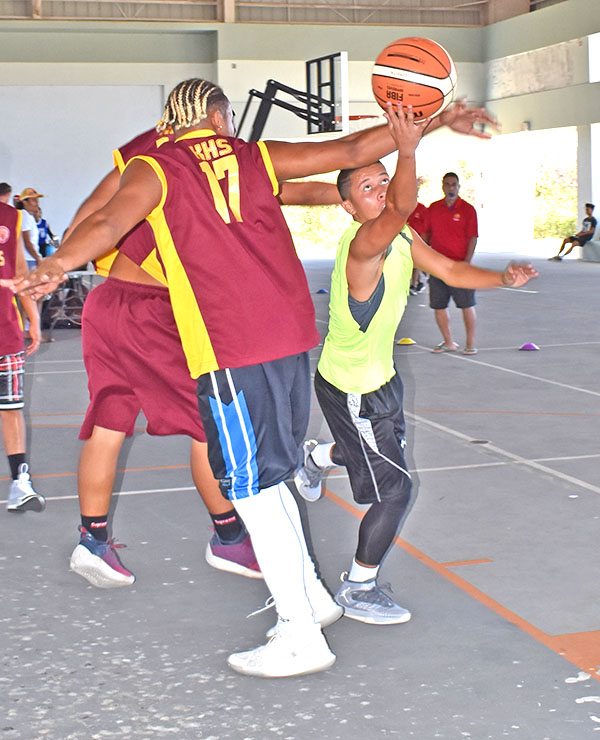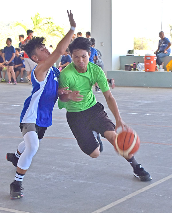 Marianas High School’s Bailey Spaeth drives against Saipan Southern High School defenders during their game in the Public School System Interscholastic 3x3 Basketball Tournament held early this month at the Koblerville Gymnasium.