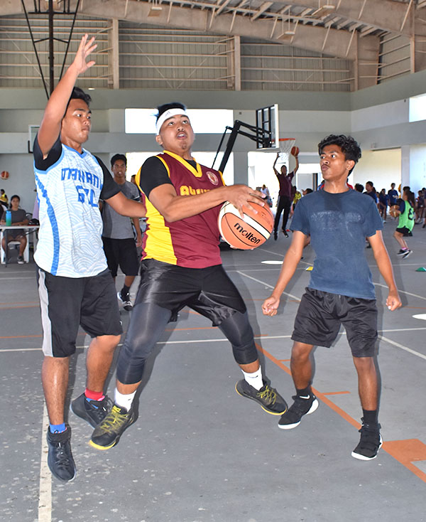 Marianas High School’s Bailey Spaeth drives against Saipan Southern High School defenders during their game in the Public School System Interscholastic 3×3 Basketball Tournament held early this month at the Koblerville Gymnasium.
