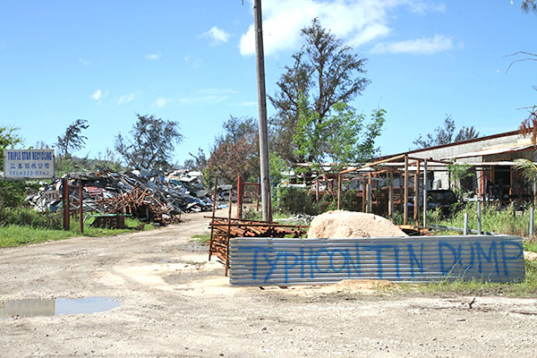 A Guam Army National Guardsman releases tie straps from a military tactical vehicle for commercial heavy equipment operators to grab roofing tin off the truck bed at a recycling center in Lower Base on Nov. 25, 2018. The GUARNG and 9th Mission Support Command Saipan, working with the Department of Public Works and the Saipan Mayor’s Office personnel, have collected more than 11,000 cubic yards of debris along primary and secondary roads.